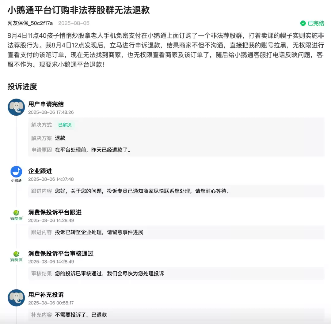 今年8月5日,一位网友在中国电子商会旗下消费者服务保障平台“消费保”上投诉称,他的孩子悄悄炒股,拿老人手机免密支付在小鹅通上面订购了一个非法荐股群。他发现后想要让商家退款,遇阻后发起投诉。