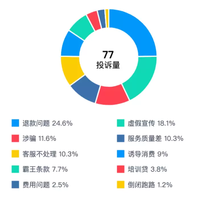 截至9月3日的最近一个月内,在消费保平台上,小鹅通共获得了77次投诉,其中退款问题投诉量最多,占比24.6%,其次为虚假宣传的投诉量,占比18.1%。