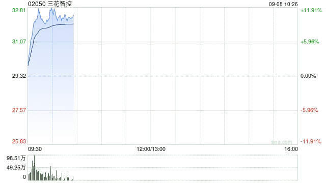 三花智控(02050)早盘涨超10%,截至发稿,股价上涨10.71%,现报32.46港元,成交额4.08亿港元。
