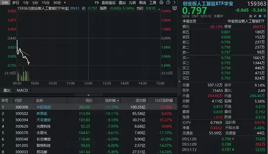 8日早盘,光模块等算力硬件重回调整,光模块含量超51%的创业板人工智能早盘下探逾4%。多只权重股飘绿,中际旭创(300308)、新易盛(300502)领跌超9%,天孚通信跌超8%,光库科技、长芯博创、太辰光(300570)、联特科技等多股下挫逾4%。同标的指数规模最大、流动性突出的创业板人工智能ETF(159363)场内价格下探逾5%,实时成交额超4亿元。