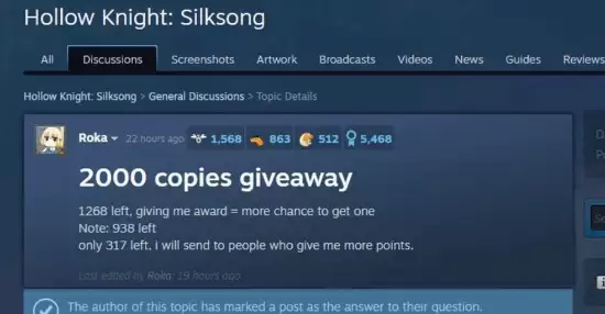 据报道,一名化名为Roka的玩家在Steam论坛发布帖子,谎称将赠送2000份空洞骑士:丝之歌,以此诱骗其他玩家赠送Steam点数。该用户不断更新帖子内容,虚构剩余名额,制造紧迫感,成功吸引了超过2000名玩家参与,借此非法获取大量点数。