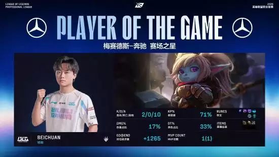 凭借整体更为出色的表现,BLG最终战胜对手,BLG打野Beichuan也凭借其关键发挥荣膺本场MVP。
