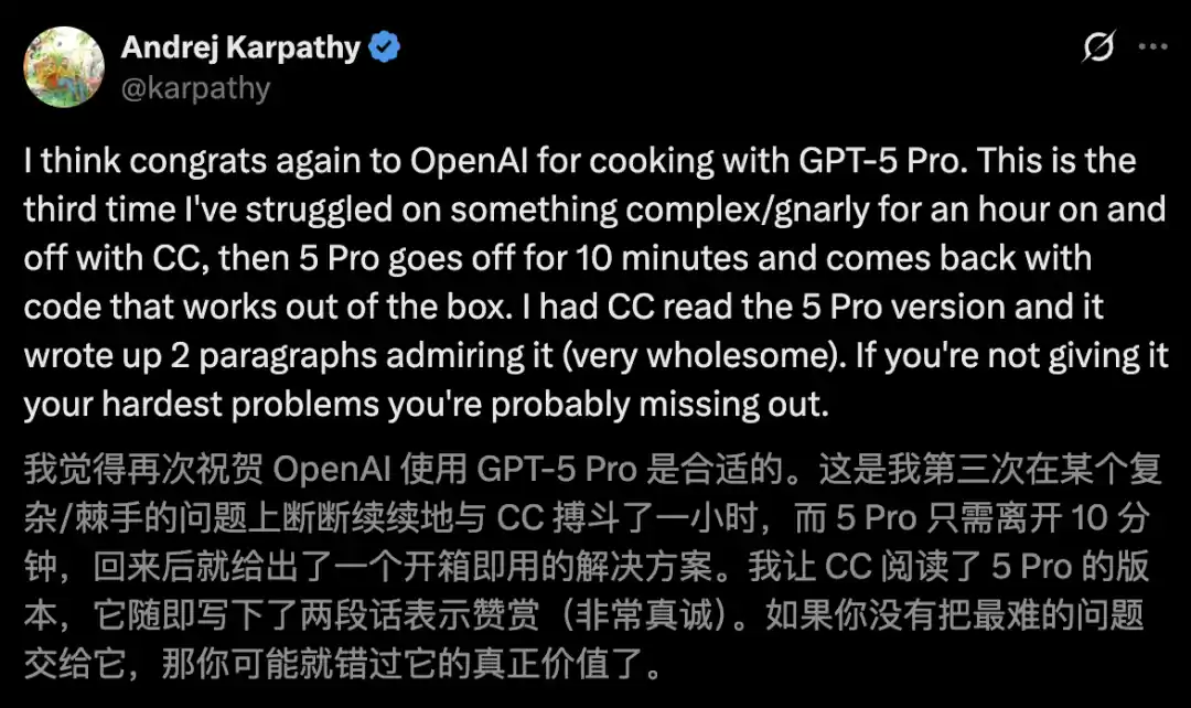 今天,Karpathy一早激动发文,「必须再吹一波OpenAI的GPT-5 Pro,真的太强了」!