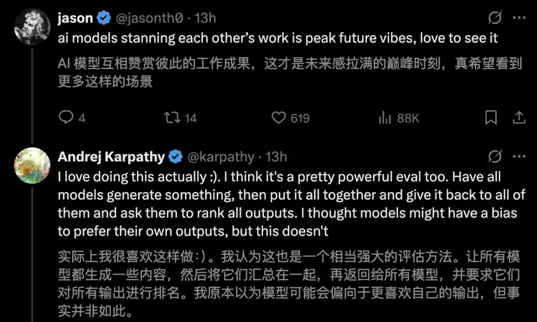 另一位网友称,「AI模型互相赞赏彼此的工作成果,这才是未来感拉满的巅峰时刻」!