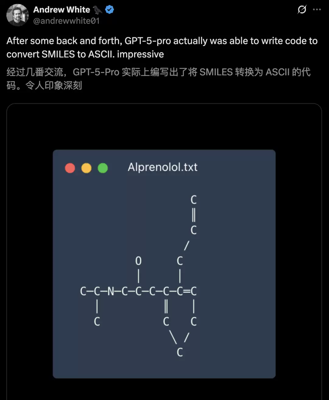 多轮交流后,GPT-5 Pro还能将SMILES转换为ASCII的代码。