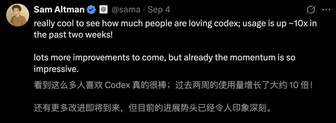 两天前,奥特曼曾官宣,过去两周Codex使用量增长了大约10倍。