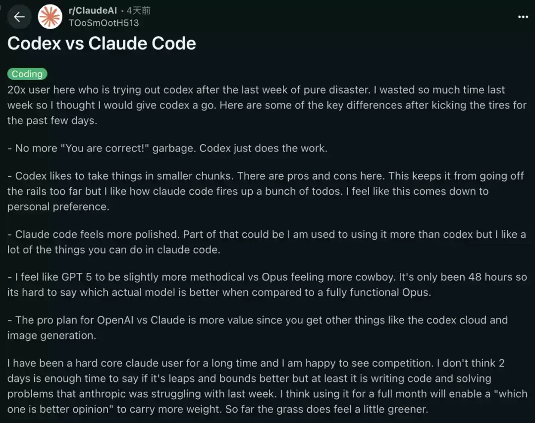一位Claude Code资深开发者,在尝试Codex 48小时后,分别点评了它们的之间的差异: