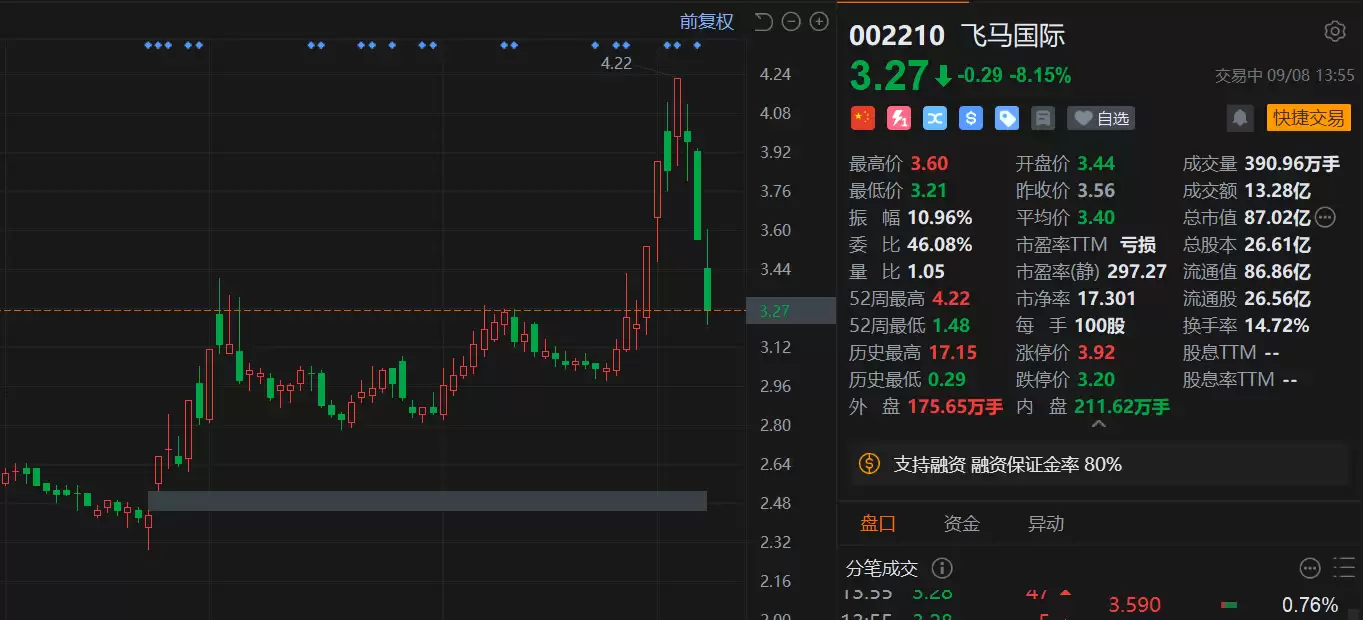 飞马国际(002210.SZ)再度下跌超8%,3日连跌近25%,近乎抹平此前涨幅,总市值87亿元。
