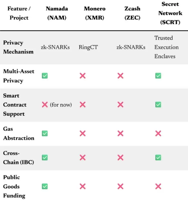 Namada 与其他隐私币的对比