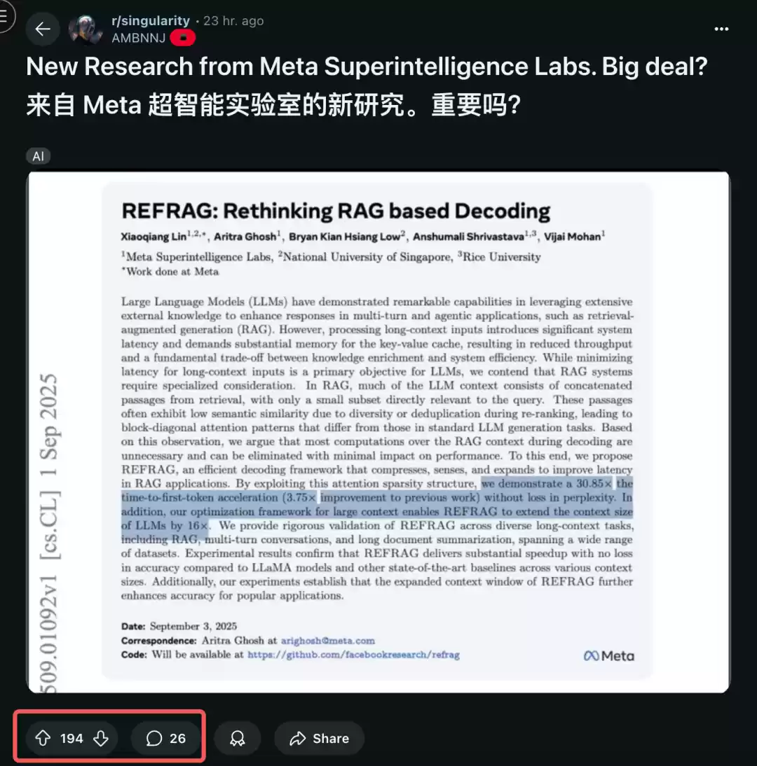 总而言之,Meta超级智能实验室的这项研究,通过巧妙的算法设计,有效解决了当前大模型在处理长上下文时面临的核心效率问题。REFRAG为开发更高效、更经济、更具扩展性的AI应用提供了一个重要的解决方案。