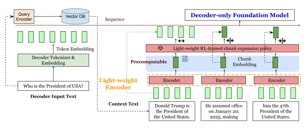 这个编码器将长篇的参考资料切分为多个“块”(chunks),并为每个“块”生成一个紧凑的向量表示——“块嵌入”(chunk embedding)。这个“块嵌入”可以视为原始文本块的浓缩摘要。