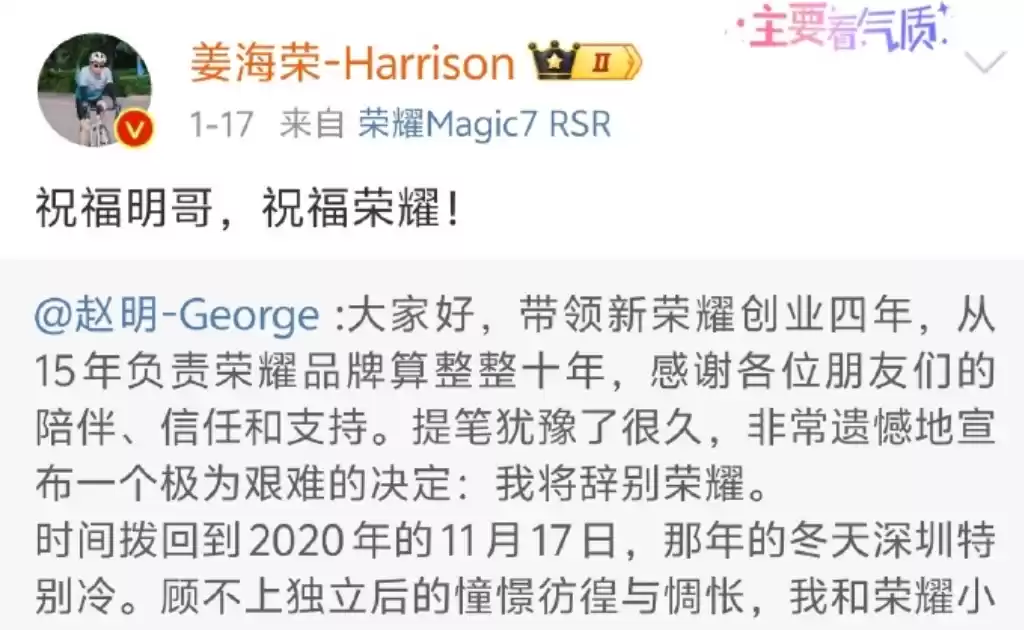 对于姜海荣的离开,当时外界并不感到意外,因为就在3天前,荣耀发生了一件更加重磅的人事变动: