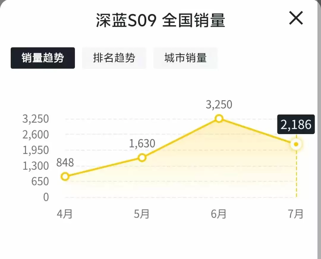 滔天的流量几乎将S09上市的消息淹没,后续销量可见一斑。懂车帝数据显示,深蓝S09完整交付的两个月只交付了5436台,“半价M9”月销还不到M9的一半。