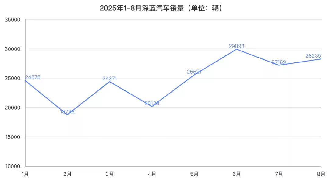 加紧绑定华为后,深蓝销量总体上更进一步,1-8月累计销量近20万辆,是去年同期的1.6倍。但每个月的销量起起伏伏,在月销3万辆大关前止步。