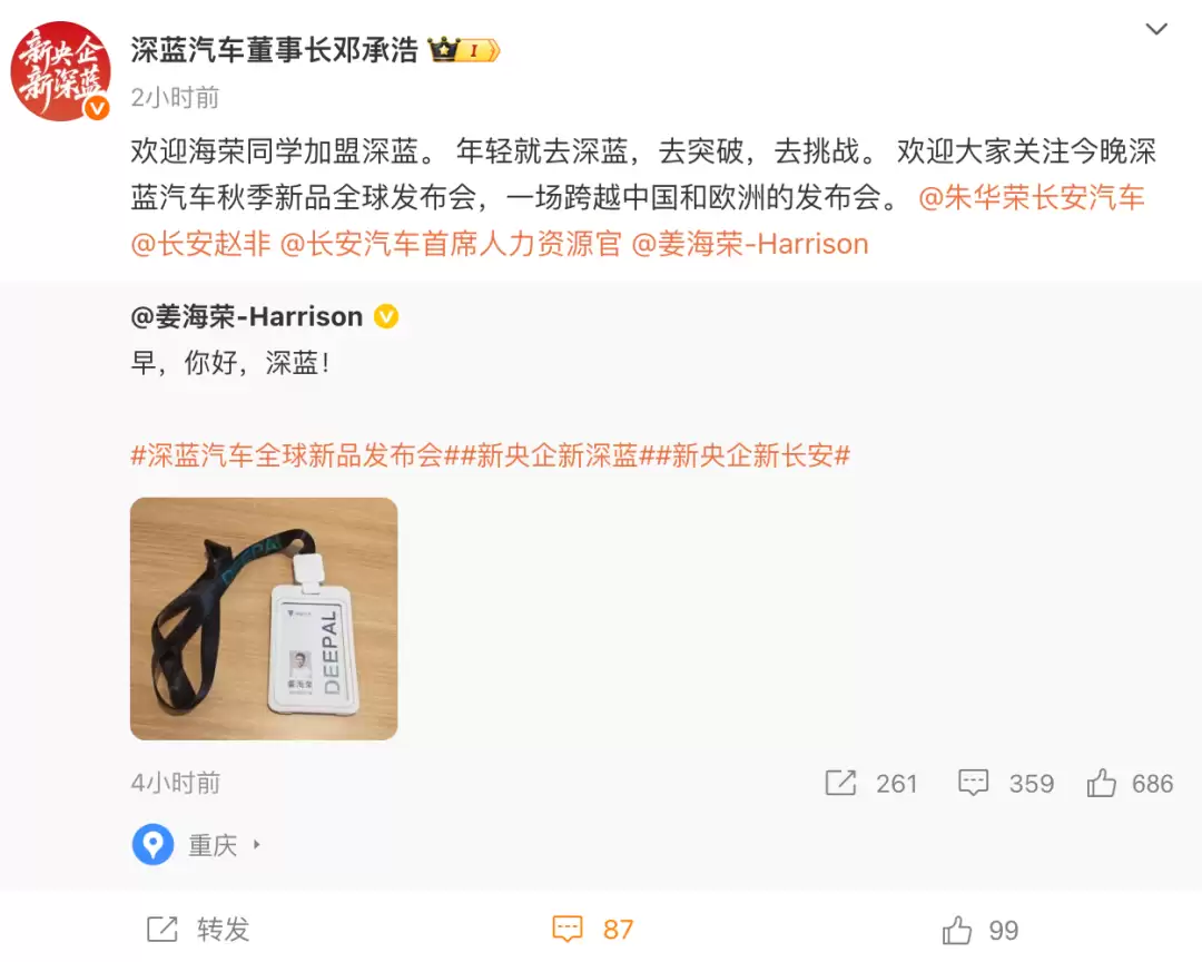三个月后,深蓝汽车CEO换将,邓承浩转任董事长。邓承浩刚刚也发布微博,对姜海荣的到来表示欢迎,并“抄送”了长安集团董事长朱华荣、总经理赵非、以及CHO谭本宏(原阿维塔CEO)。