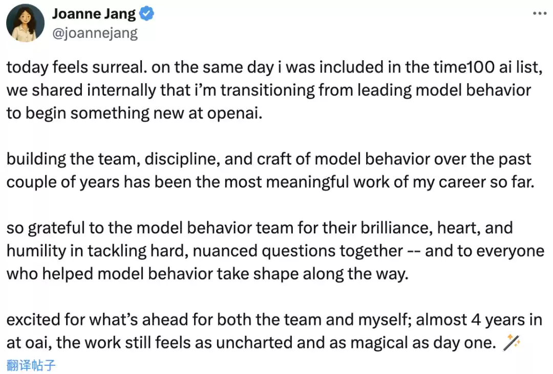 上周,Joanne发推称,她将离开模型行为团队,并“在OpenAI开启新的篇章”。