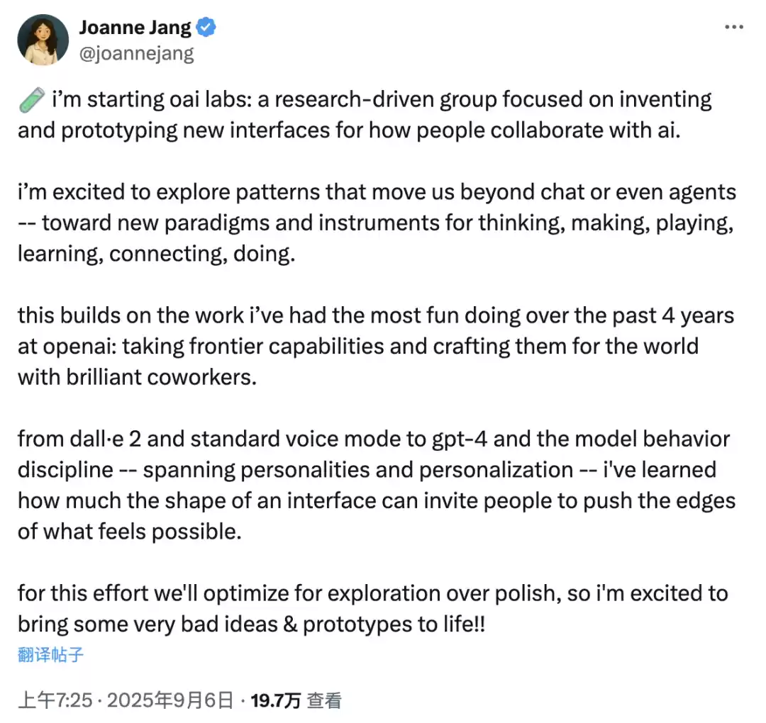 随着重组的进行,其创始负责人Joanne Jang,也正在组建一个名为OAI Labs的新研究团队。