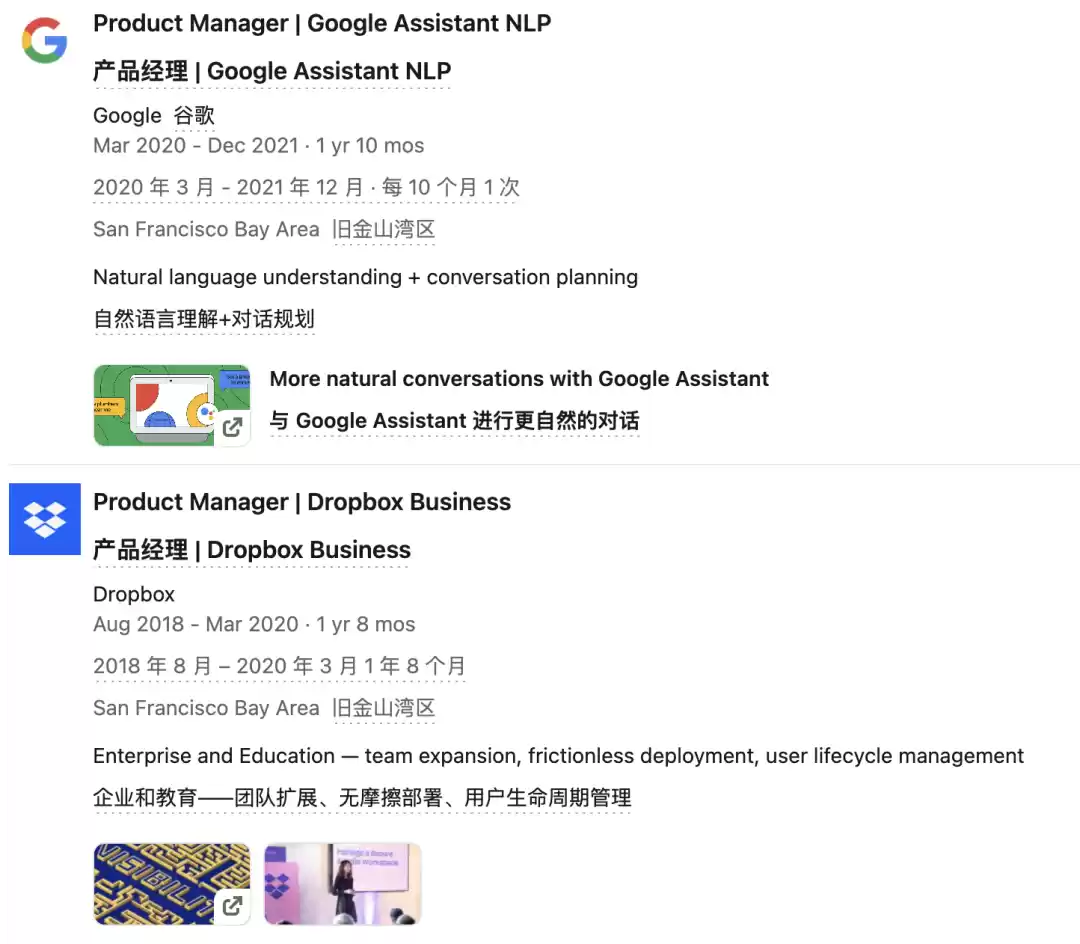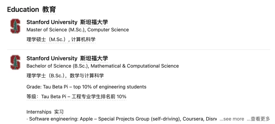 此外,她还曾担任Dropbox产品经理、斯坦福助教等工作,实习经历则包括苹果、迪士尼等。