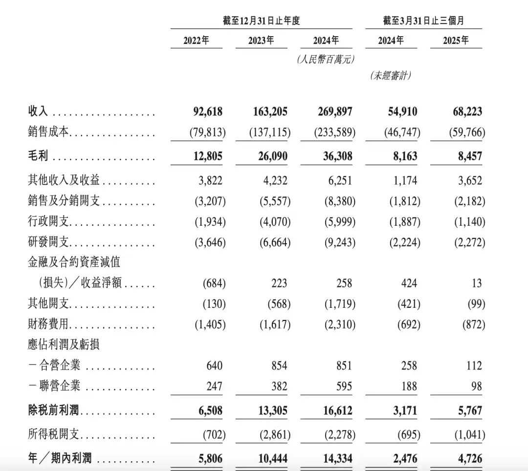 根据奇瑞汽车披露的招股书,奇瑞汽车近年来营收和净利润持续增长。2024年、2024年、2024年以及2025年一季度,奇瑞分别实现营收926.18亿元、1632.05亿元、2698.97亿元、682.23亿元;分别实现净利润58.06亿元、104.44亿元、143.34亿元、47.26亿元。