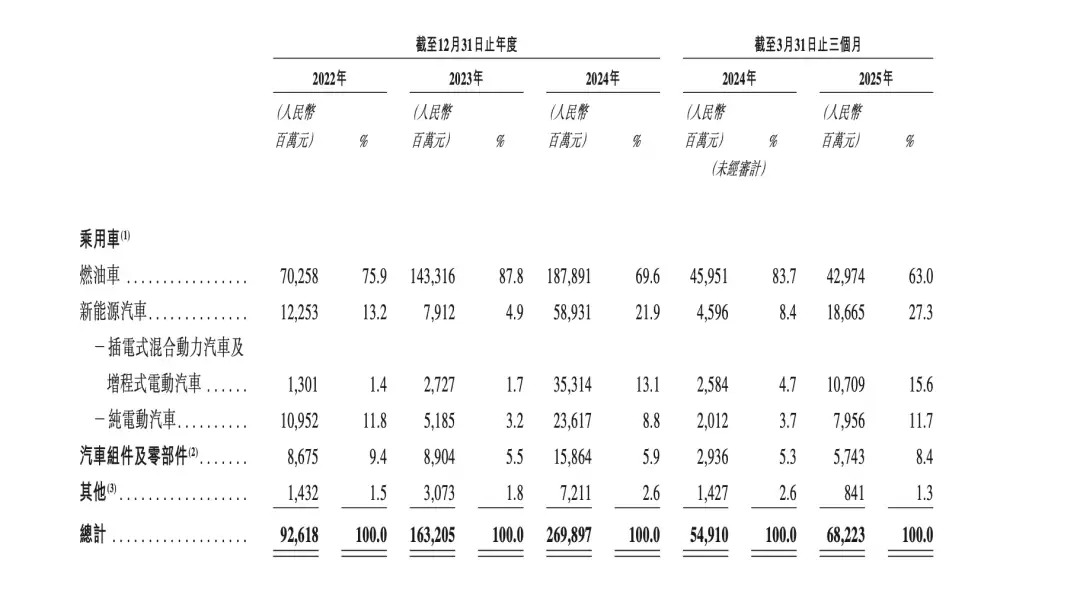 反映在收入上,燃油车业务贡献大头。根据招股书,奇瑞汽车2024年、2024年、2024年、2025年一季度的燃油车收入占比分别为75.9%、87.8%、69.6%、63.0%,新能源汽车收入占比分别为13.2%、4.9%、21.9%、27.3%。