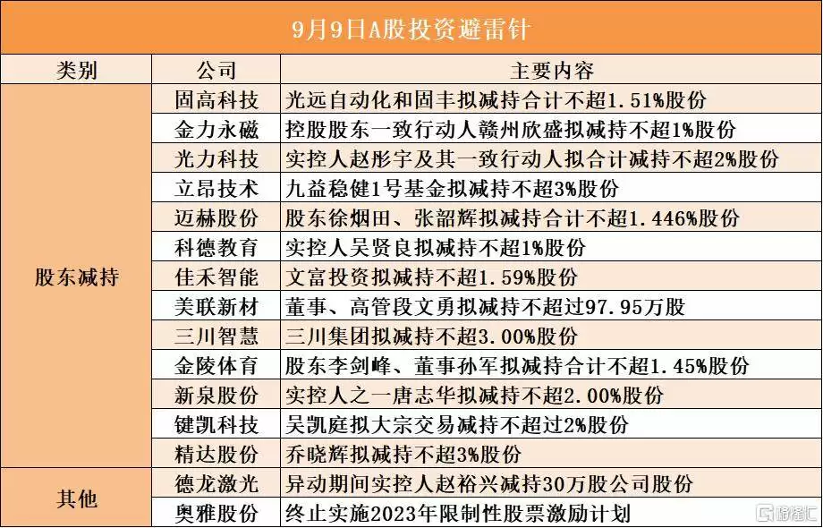 9月9日A股投资避雷针︱光力科技:实控人赵彤宇及其一致行动人拟合计减持不超2%股份