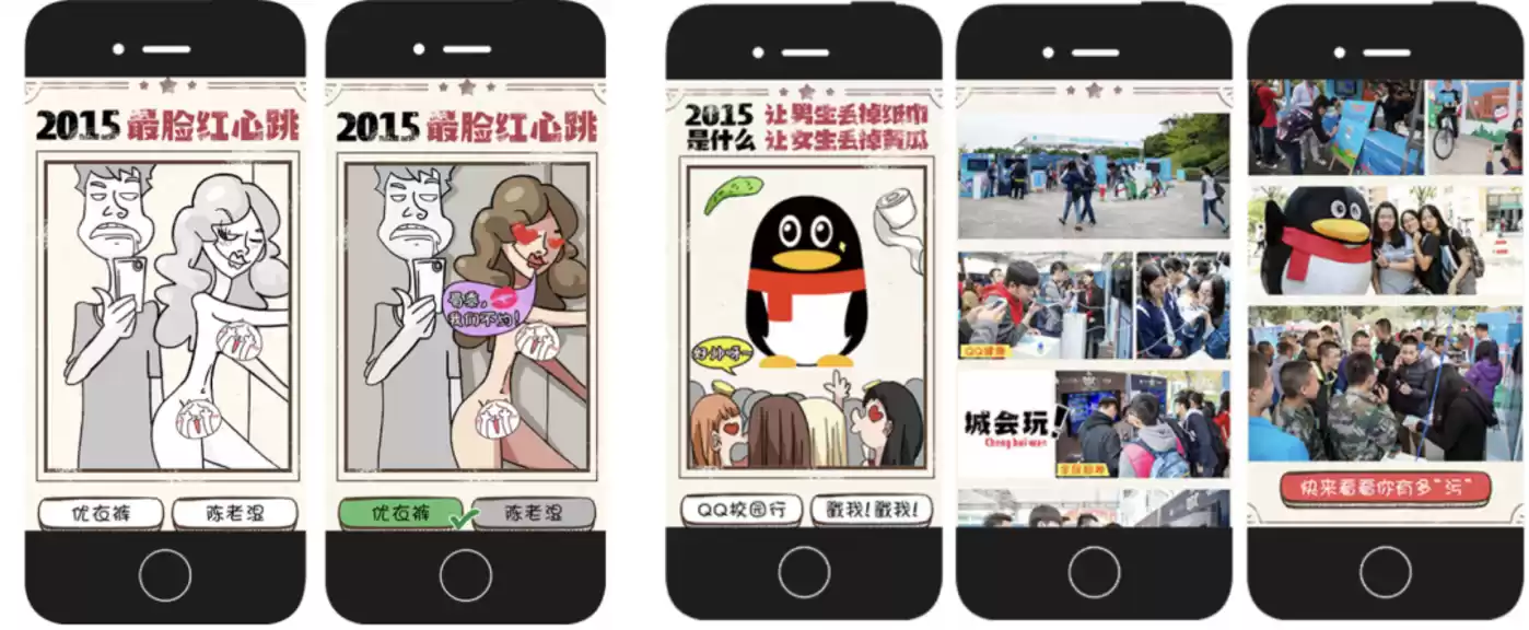 再来看看10年前腾讯SNG市场部为QQ校园行活动做的推广H5。画面不仅在暗示当年的优衣库试衣间事件,而且文案「让男生丢掉纸巾,让女生丢掉黄瓜」,放在今天的互联网上,估计会被打拳,可能官媒都可能出场痛批。