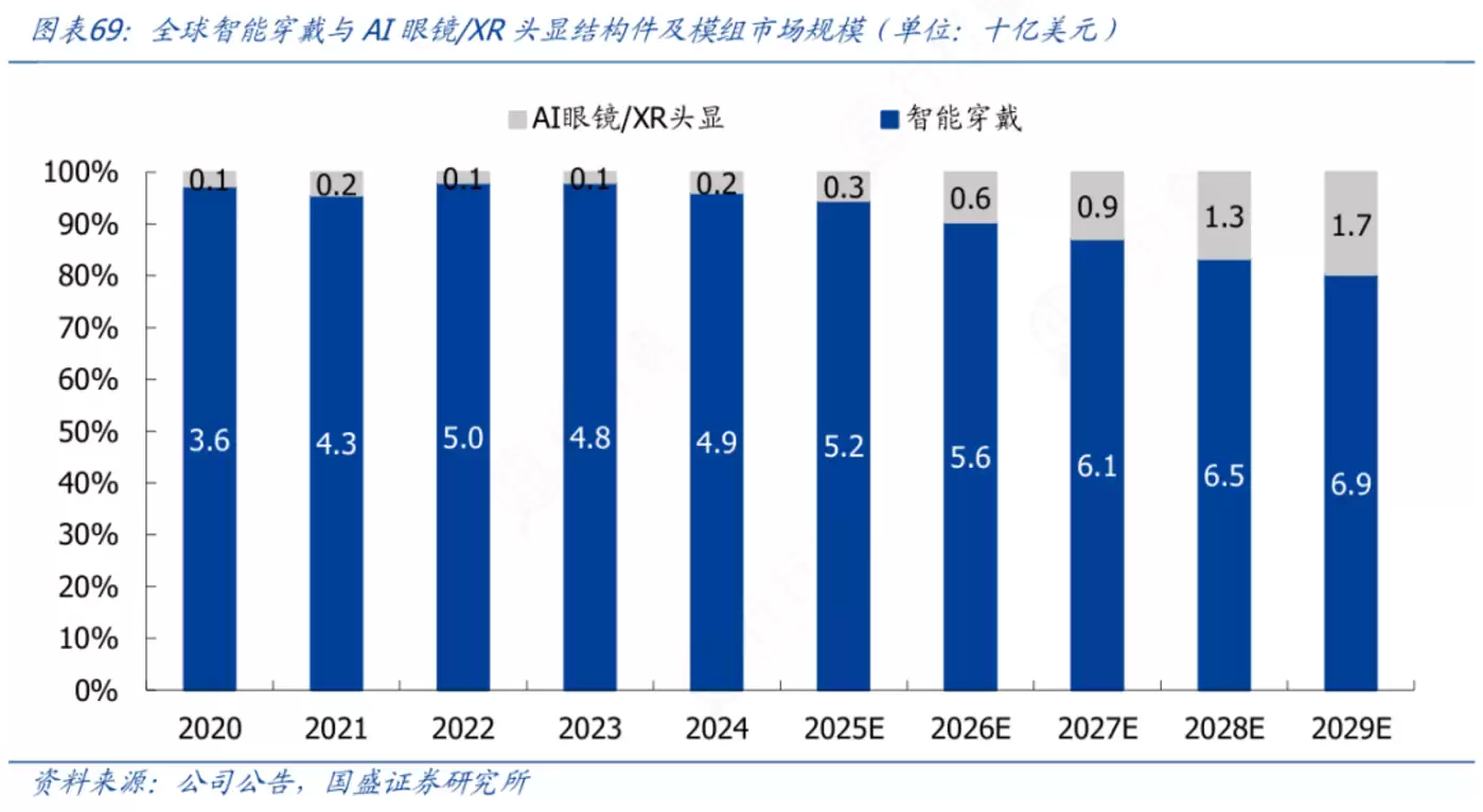 全球智能穿戴与AI眼镜/XR头显的结构件及模组市场,正以超乎预期的速度膨胀,根据天眼查公开数据显示,从2020年的37亿美元飙升至2029年预测的86亿美元,其中AI眼镜/XR头显细分市场增速尤为惊人,从2020年的1亿美元跃升至2029年的17亿美元,复合增长率远超智能穿戴领域。