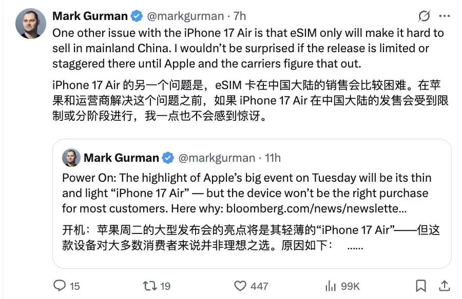 与此同时,预计将在9月10日发布会上成为亮点的全新轻薄机型“iPhone 17 Air”,可能因其仅支持eSIM卡的设计而在中国市场遭遇准入难题。古尔曼称,这一硬件规格可能导致该机型在中国的发布“受到限制或推迟”,直到苹果与运营商找到解决方案。