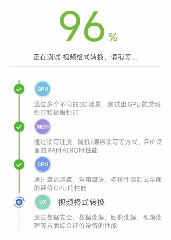 新增视频格式转换测试,评估设备多媒体处理能力的同时,间接反映整个系统的数据传输效率。