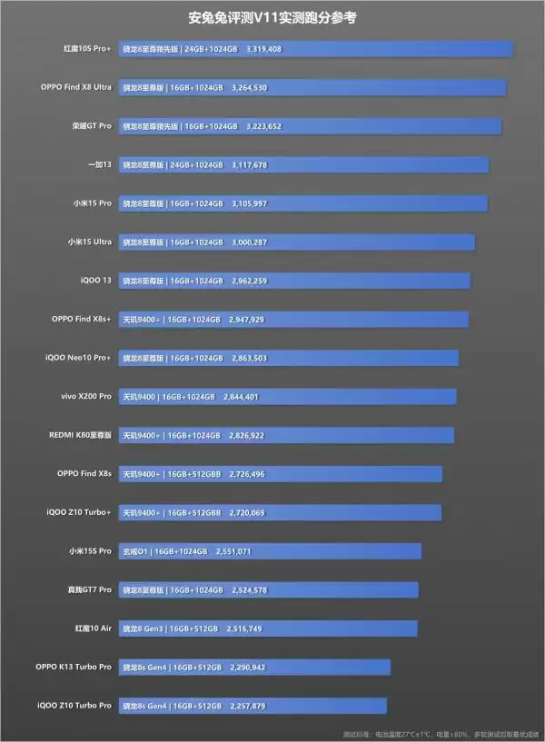 以下是我们在室温27℃±1℃,剩余电量80%以上,并固定300nit的情况下,实测的一部分V11分数,以供大家参考。