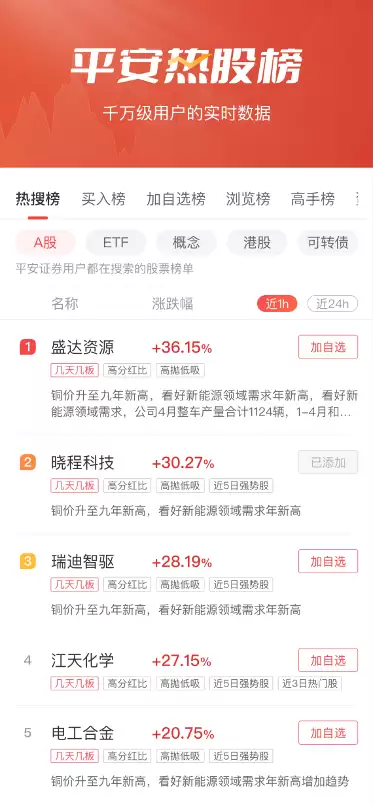 目前,平安热股榜设有六大维度榜单:热搜榜、自选榜、浏览榜、高手榜、人气飙升榜和资讯榜,全面覆盖沪深股票、板块、ETF及可转债等多类资产,为客户提供丰富而立体的市场参考。凭借其出色的实用价值和用户体验,平安热股榜展现出强大的用户粘性,日服务客户250万人次,客户次日留存率超60%,已成为众多投资者信赖的日常工具。