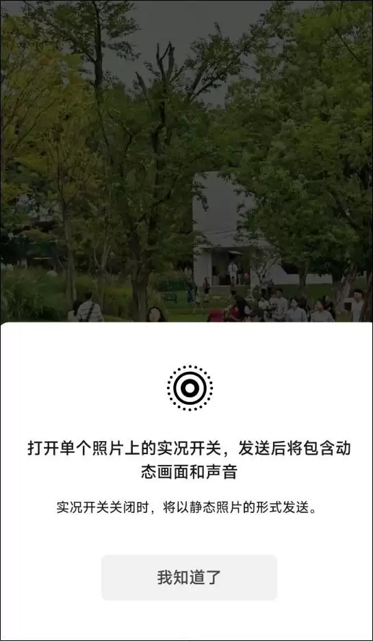 用户在发送图片时,可打开单个照片上的实况开关,发送后将包含动态画面和声音(实况开关关闭时,将以静态照片的形式发送)。