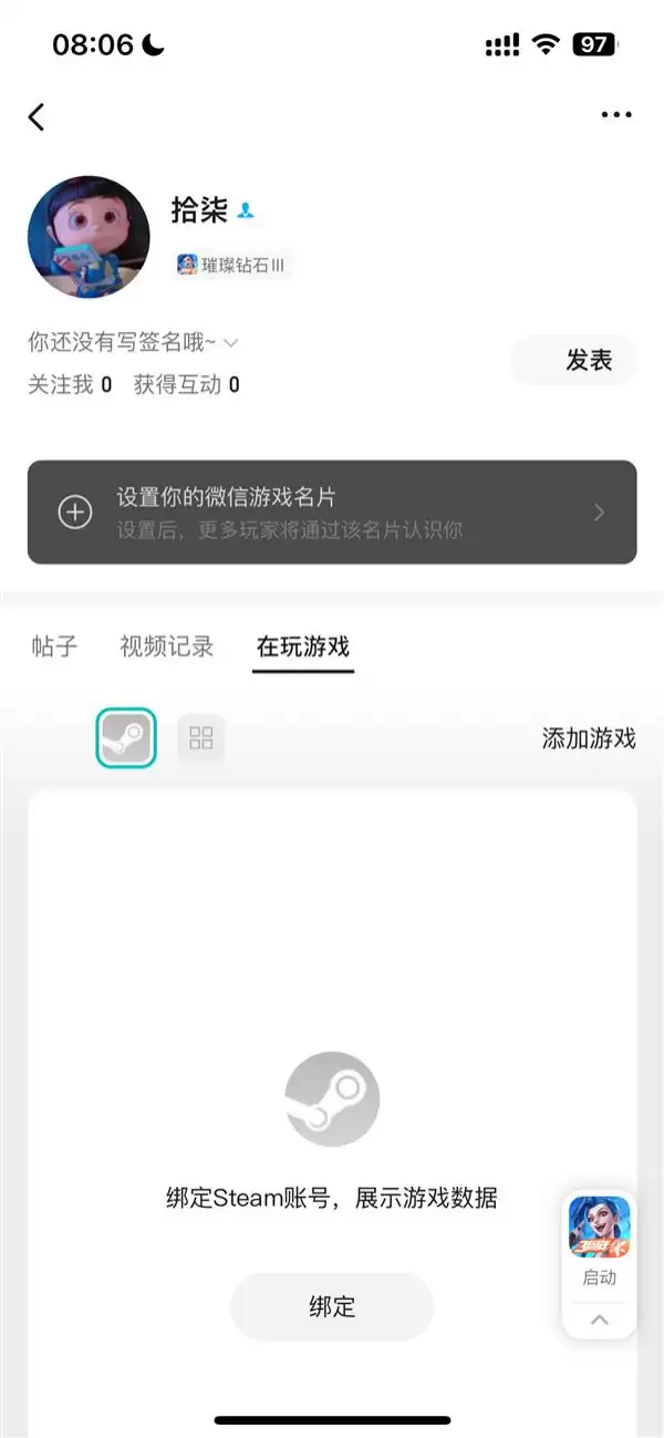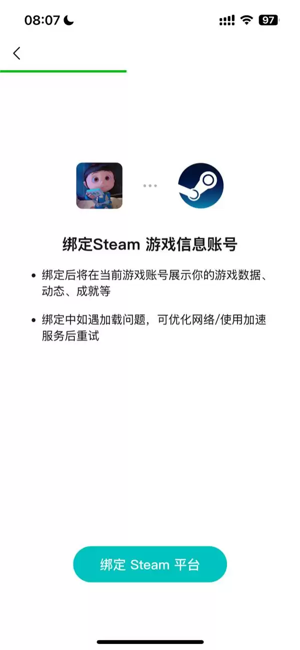 微信绑定路径:发现页 - 游戏 - 点击右上角 " 小人 " 图标,进入即可绑定 Steam 账号。