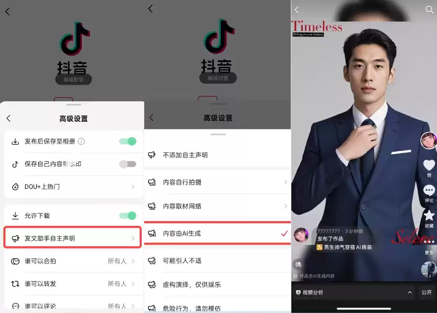 抖音此次发布的《公告》介绍,在抖音注册的账号若制作、发布AI内容,需使用平台提供的标识功能主动添加显式标识。