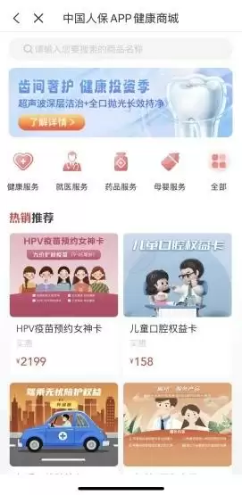 作为保险行业的*之一,中国人保也全面发力,以“中国人保”APP为核心载体。打造更加贴近大众日常健康需求的一站式解决方案。近期,该APP升级完成的“健康商城”正式上线,集成13大类健康服务场景,覆盖体检、齿科、眼科、中医、用药、母婴、慢病管理、就医陪诊、远程问诊等核心环节,可满足全年龄段、全家庭的常见健康需求,实现了从基础健康管理到专科医疗支持、从单一用户服务到全家庭成员覆盖的服务闭环。
