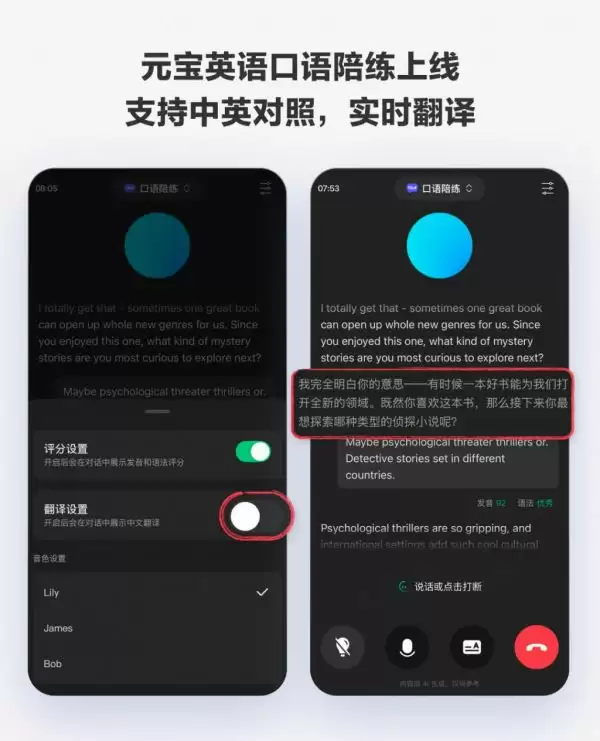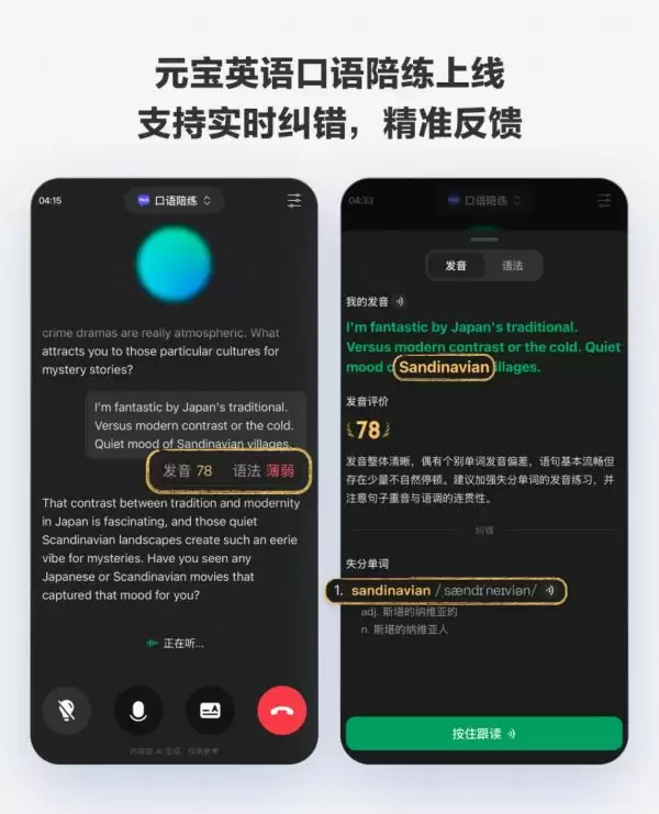 在练习中,元宝能对用户的发音和语法进行即时评分与纠正,并高亮标记错误单词,用户还能反复进行跟读巩固。为了降低入门门槛,该功能还支持实时中英字幕,用户甚至可以用中文提问以获取地道表达。