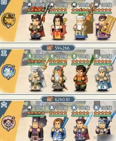 3.五虎队:关羽、马超、黄忠、张飞,援助赵云。爆发高,适合PVP,PVE较弱。