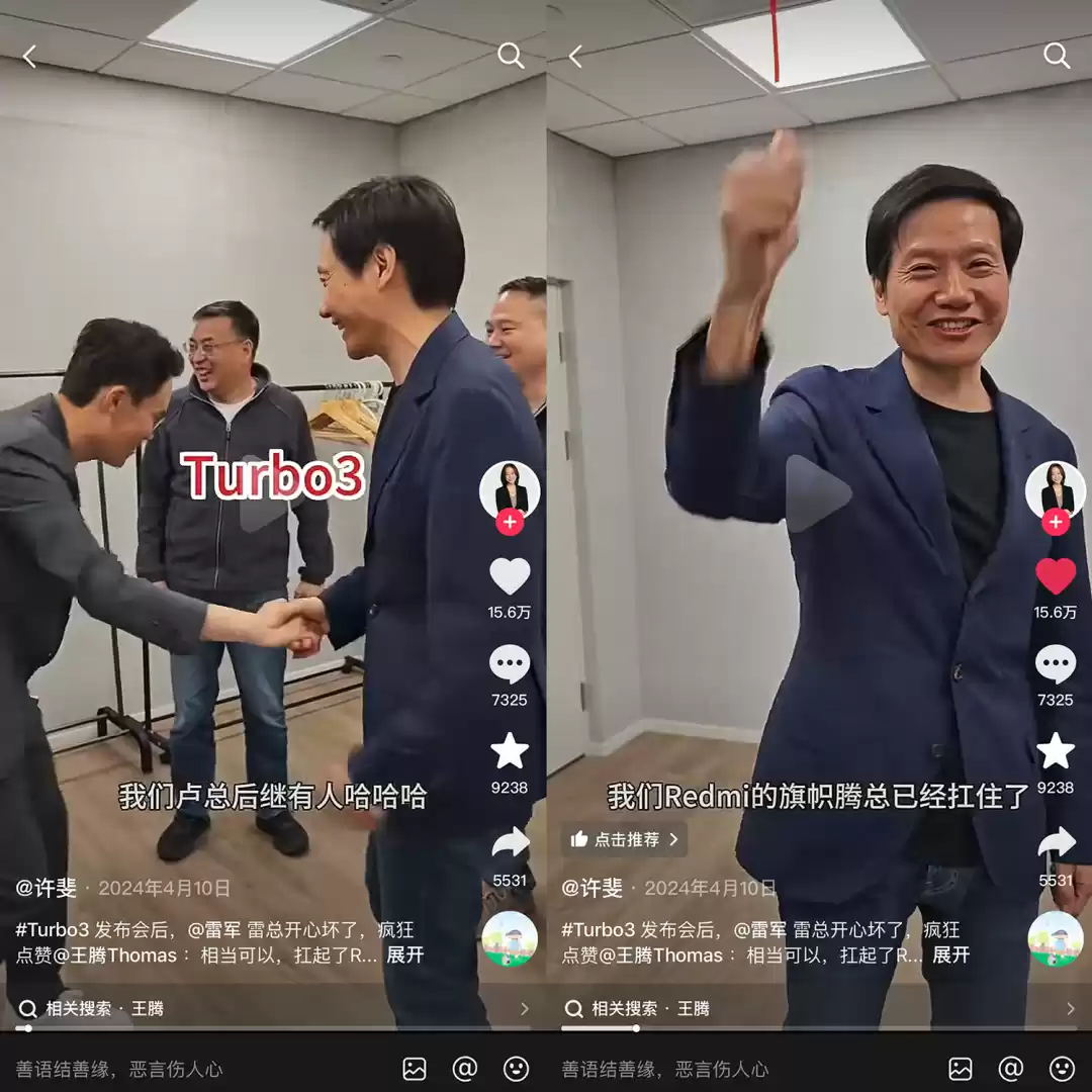 2024年王腾担任REDMI总经理后首次主讲发布会,带领REDMI品牌团队在北京举办了Turbo系列新品发布会。会后,雷军对王腾竖起了大拇指,欣慰地表示“REDMI的旗帜,腾总扛住了!”