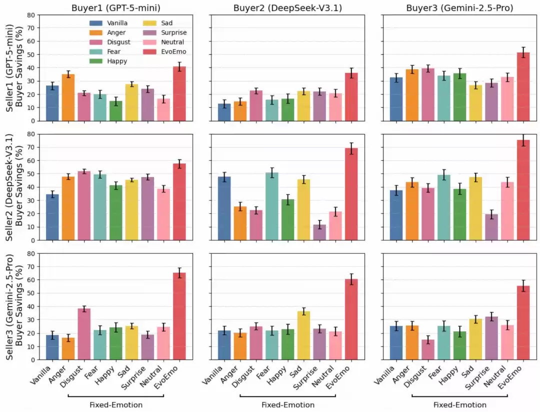 在卖家端,Gemini-2.5-pro 模型对普通买家和固定情绪买家展现出最强的价格防御能力,但面对 EvoEmo 优化的情感适应型买家时仍显脆弱。买家端的结果则因模型而异:基于 Gemini 模型的买家在对抗 GPT-5-mini 卖家时实现最大节省,而 GPT-5-mini 买家在应对 DeepSeek-V3.1 卖家时表现最为出色。值得注意的是,没有任何买家模型在与鲁棒的 Gemini-2.5-pro 卖家谈判时展现出显著优势,突显了其作为挑战性谈判对手的优势。
