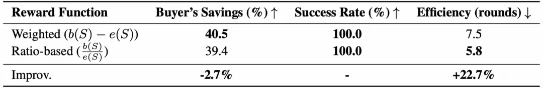 以及科学化的奖励机制。进化优化通过奖励函数评估策略,奖励函数可解释为适应度评分,用于衡量协商有效性。AI 的每轮谈判都会被打分:谈判成功得基础分,买家省的钱越多、用的回合越少,加分越多。这种“成功率 + 省钱 + 效率” 的评分标准,督促 AI 不会为了省钱硬耗,也不会为了快而轻易让步,精准找到最佳平衡点。