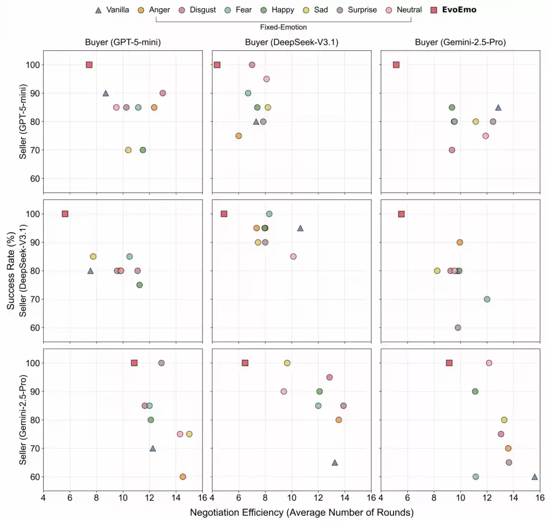 在评估过程中,研究人员定义了两个基准模型进行对比:第一个基准仅包含标准 Agent,买方和卖家均未接受情绪引导。这种设置确保双方完全依据内在情绪倾向和战略推理能力行动,从而提供反映默认谈判行为的参考基准。
