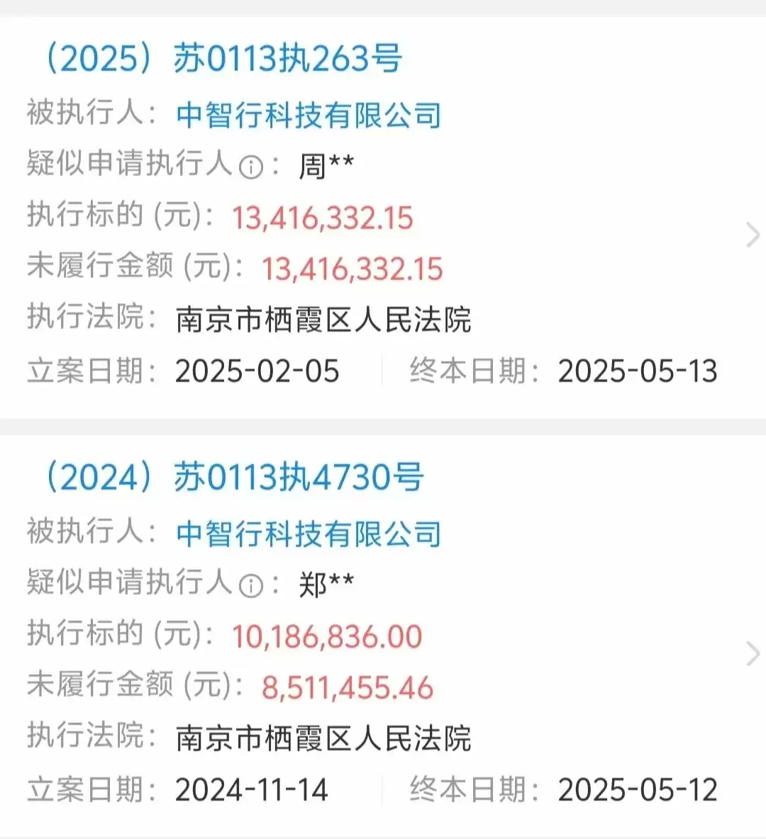 并且,经过法院调查,中智行早已涉及多件执行不能案件,涉案金额巨大,资不抵债,符合受理破产的条件,才依法予以受理。企查查显示,从 2024 年 10 月开始,中智行多次成为被执行人,历史被执行总金额达 4569.06 万元;两起终本案件的执行标的总金额为 2360.32 万元,其中未履行金额 2192.78 万元,未履行比例达 92.9%。
