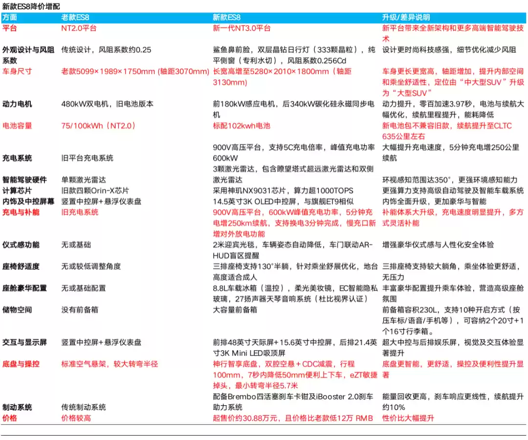 由于新款ES8从NT2.0平台切换到NT3.0平台,而NT3.0平台对高压快充(800V升级到900V),电子电气架构)从分布式域控升级到中央计算架构,同时轻量化设计也大幅降低了能耗。
