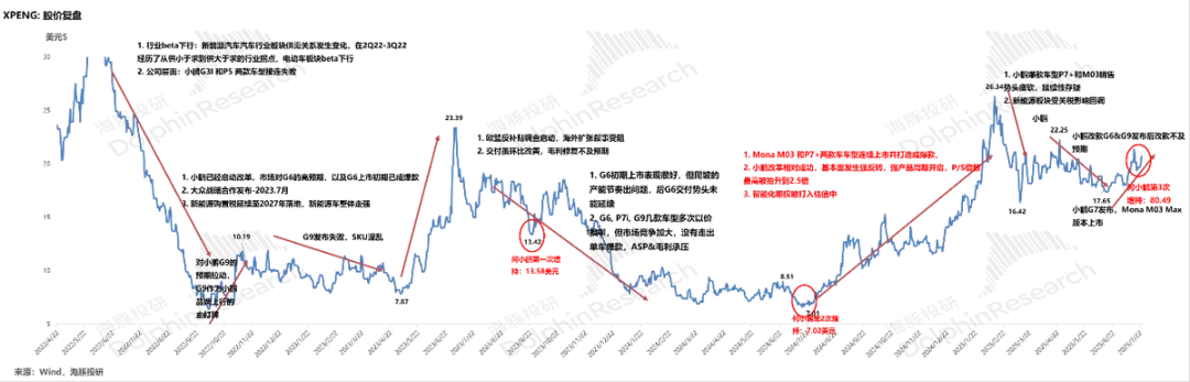 后P7+和Mona M03 上市,相比同级竞品极具性价比,通过高性价比+高颜值+长续航+智能化优势占据市场,成功打造成爆款,而公司的本轮产品强周期从2024年一直持续到2026年,小鹏基本面发生了强反转,这也带动了小鹏的股价从最低点7美元迅速拉涨276%至2025年1月最高点26美元。