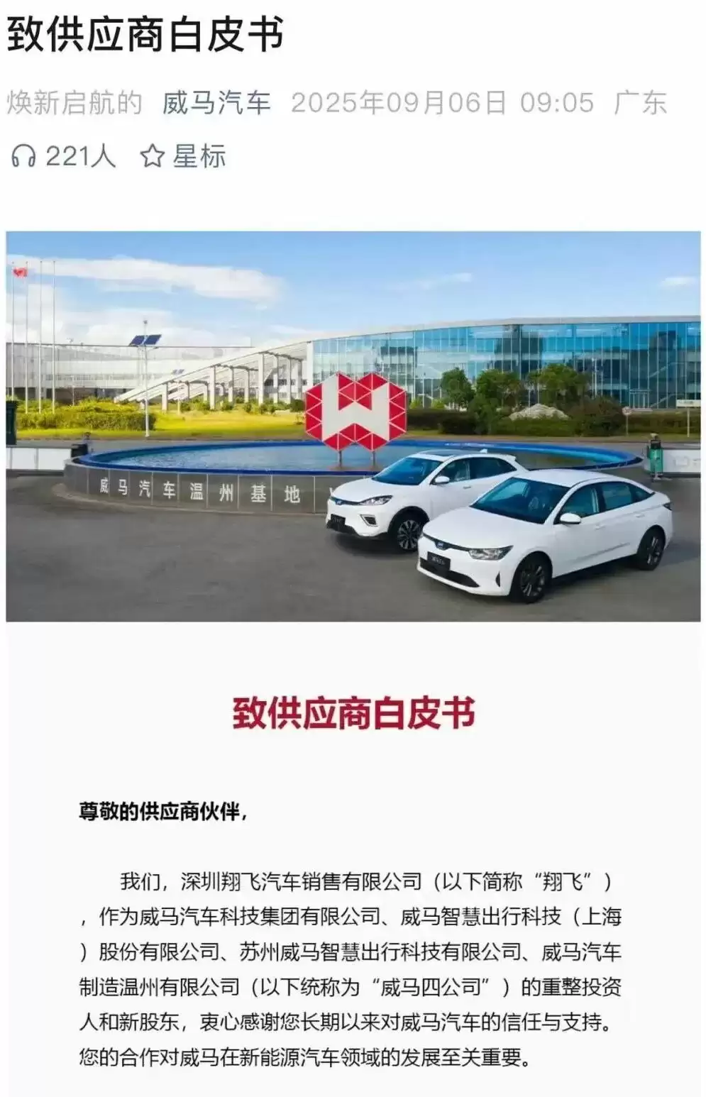 停更两年多,威马汽车最新微信公众号在9月6日发布的《致供应商白皮书》不仅透露出深圳翔飞汽车销售有限公司(以下简称“翔飞汽车”)成为新股东,威马复工复产还得到上海市和温州市两地政府的支持,并对未来新威马的发展做出了“三步走”详细规划。