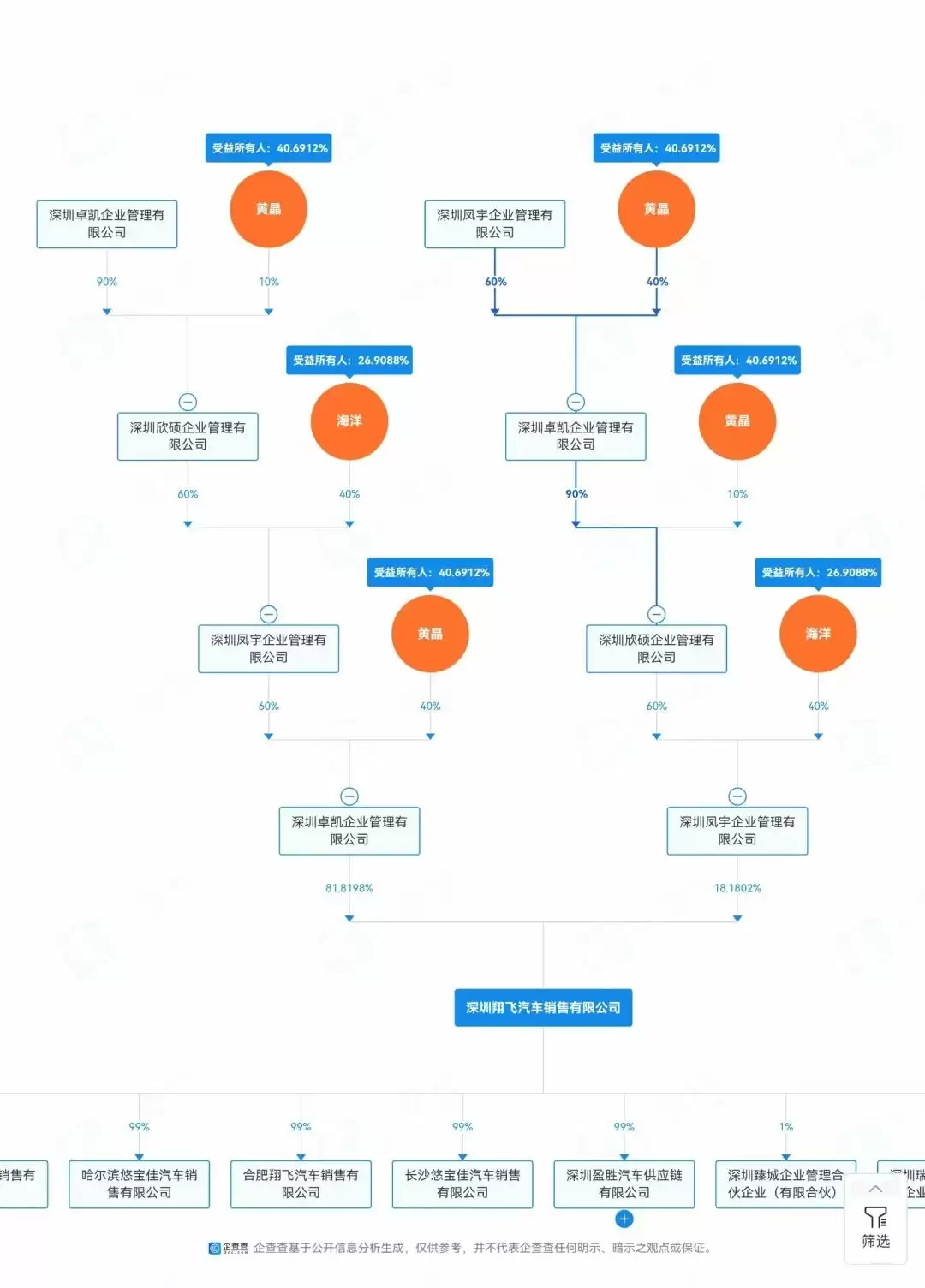 《IT时报》记者通过企查查的股权透视图发现,翔飞汽车的两位股东分别是深圳卓凯企业管理有限公司和深圳凤宇企业管理有限公司。其中,深圳凤宇企业管理有限公司的股东之一是深圳欣硕企业管理有限公司。同时,卓凯、凤宇、欣硕这三家公司互为股东,股权关系紧密。