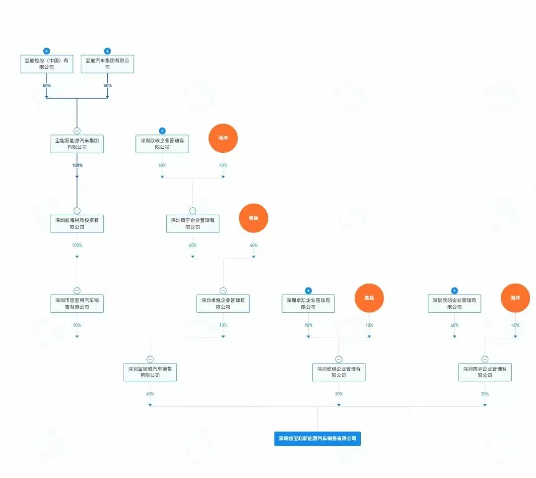 深圳凤宇企业管理有限公司与深圳欣硕企业管理有限公司还入股了一家名为深圳悠宝利新能源汽车销售有限公司,而悠宝利的控股股东是深圳宝驰威汽车销售有限公司,通过股权向上延伸,控股宝驰威的正是宝能汽车集团。