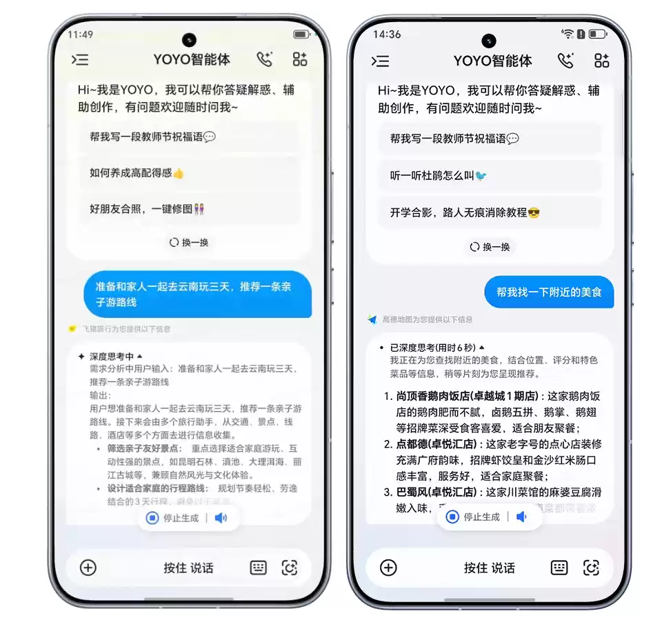 (图:荣耀手机用户使用飞猪智能体、高德地图智能体界面)