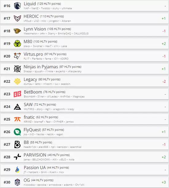 TOP10战队中,FURIA、Natus Vincere和FaZe战队均有小幅度下滑,但尚未跌出TOP10行列。