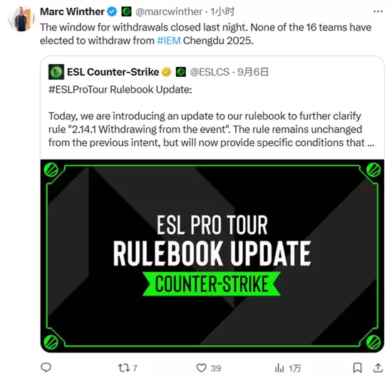 今天ESL游戏电竞生态总监Marc Winther在社交平台上表示:“退赛的截止日期是昨晚。16支参赛队伍中无一选择退出IEM 成都站。”